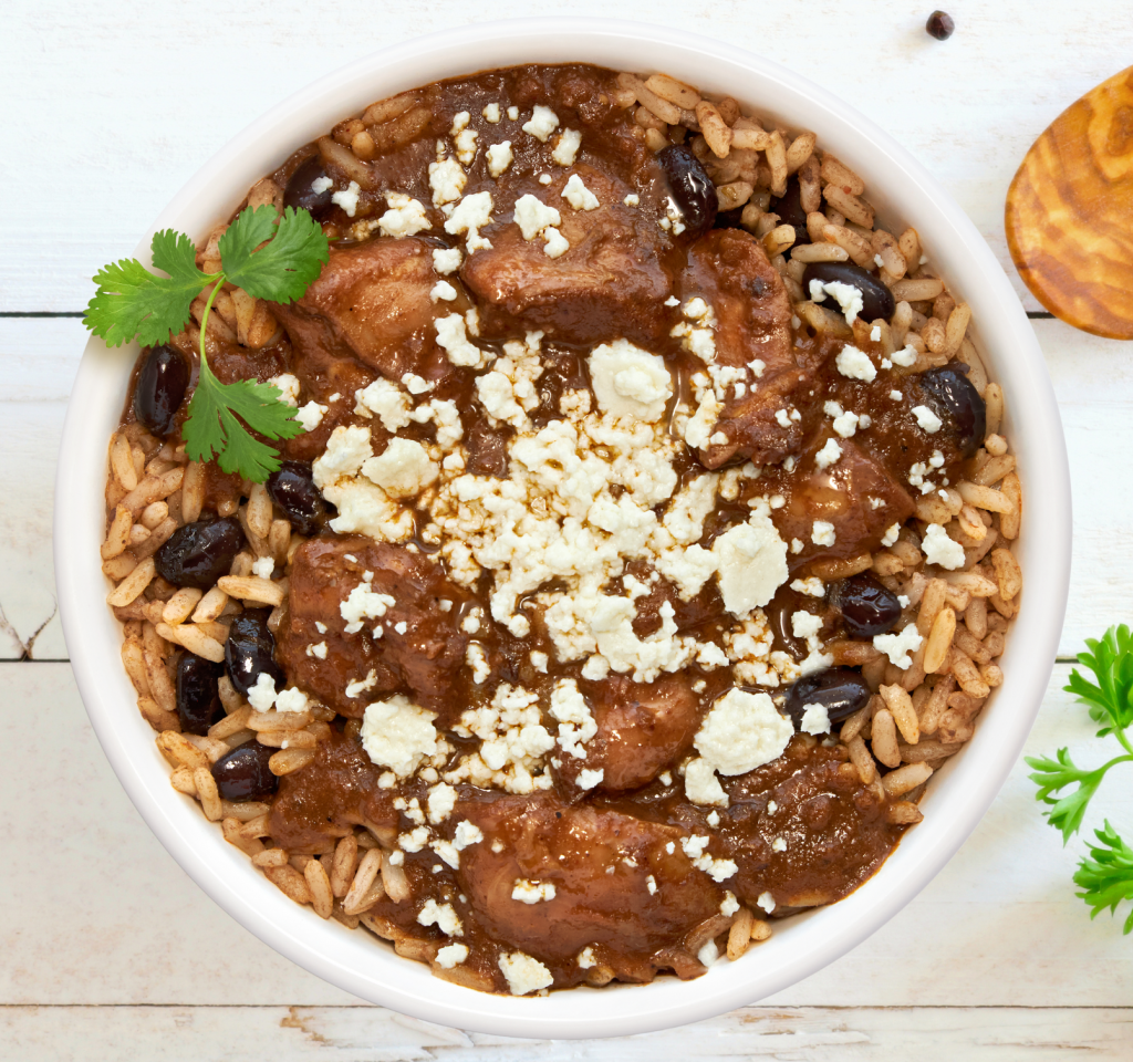 Our Chicken Mole Burrito Bowl features tender dark meat chicken simmered in traditional mole sauce, served over rice and beans, and finished with a sprinkle of queso fresco. Every bite delivers deep, rich, and authentic flavor.